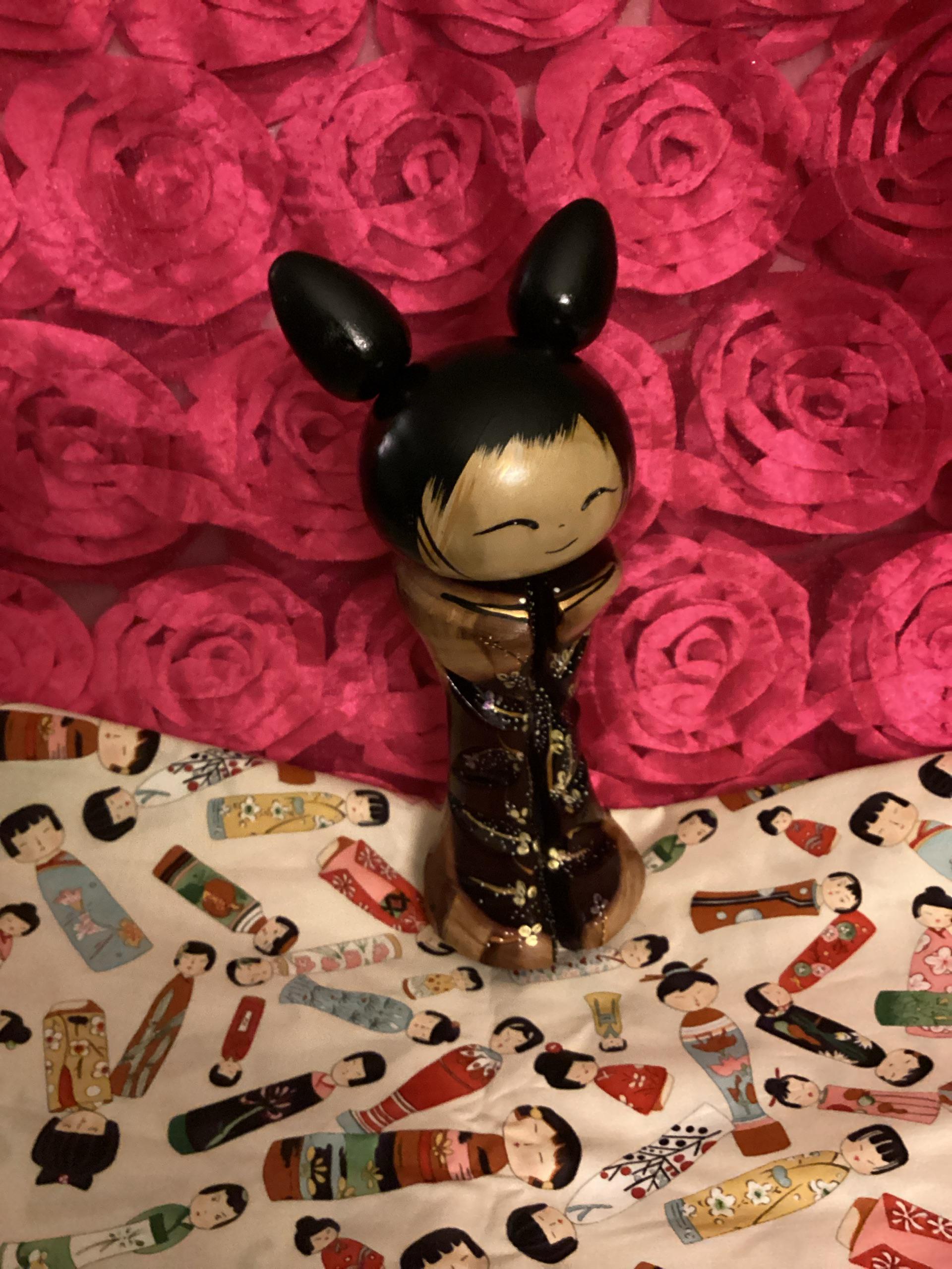 Daliha is a beautiful Kokeshi lady made from a beautiful piece of Australian Purple Heart. She also has carved sections making her an unusual find! Jacob and Lisa Hodsdon are the artists who fashioned Daliha into the treasure she became! The natural wood colors are so distinct with the dark purple brown and contrasting light butter brown! I love to hold her! Daliha is heavy and substantial with crevices and carved indentations on her front side. I couldn’t love her more!